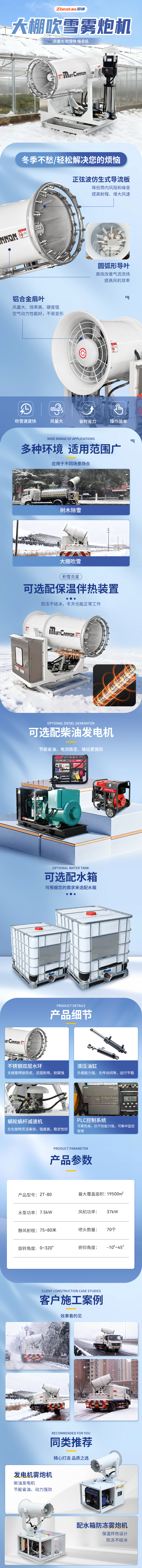 產(chǎn)品特點:這款ZT-80型大棚吹雪霧炮機,是鄭州鄭通風機制造有限公司專為清雪與綠植保護設計,搭載 70-80米射程大功率風機,風速達 70-80 米 / 秒,每小時可清理 800-1500 米綠化帶,效率超人工 20 倍。無接觸吹雪設計,風力柔和可控,避免樹枝折斷與根系損傷,杜絕融雪劑危害。支持 100 米無線遙控,操作員遠離車流更安全,水平 320° 旋轉(zhuǎn) + 仰俯調(diào)節(jié)實現(xiàn)精準覆蓋。可車載移動,適配主干道、公園等復雜場景,邊走邊作業(yè)。一機多用,冬季吹雪、夏季降塵降溫,全年不閑置。